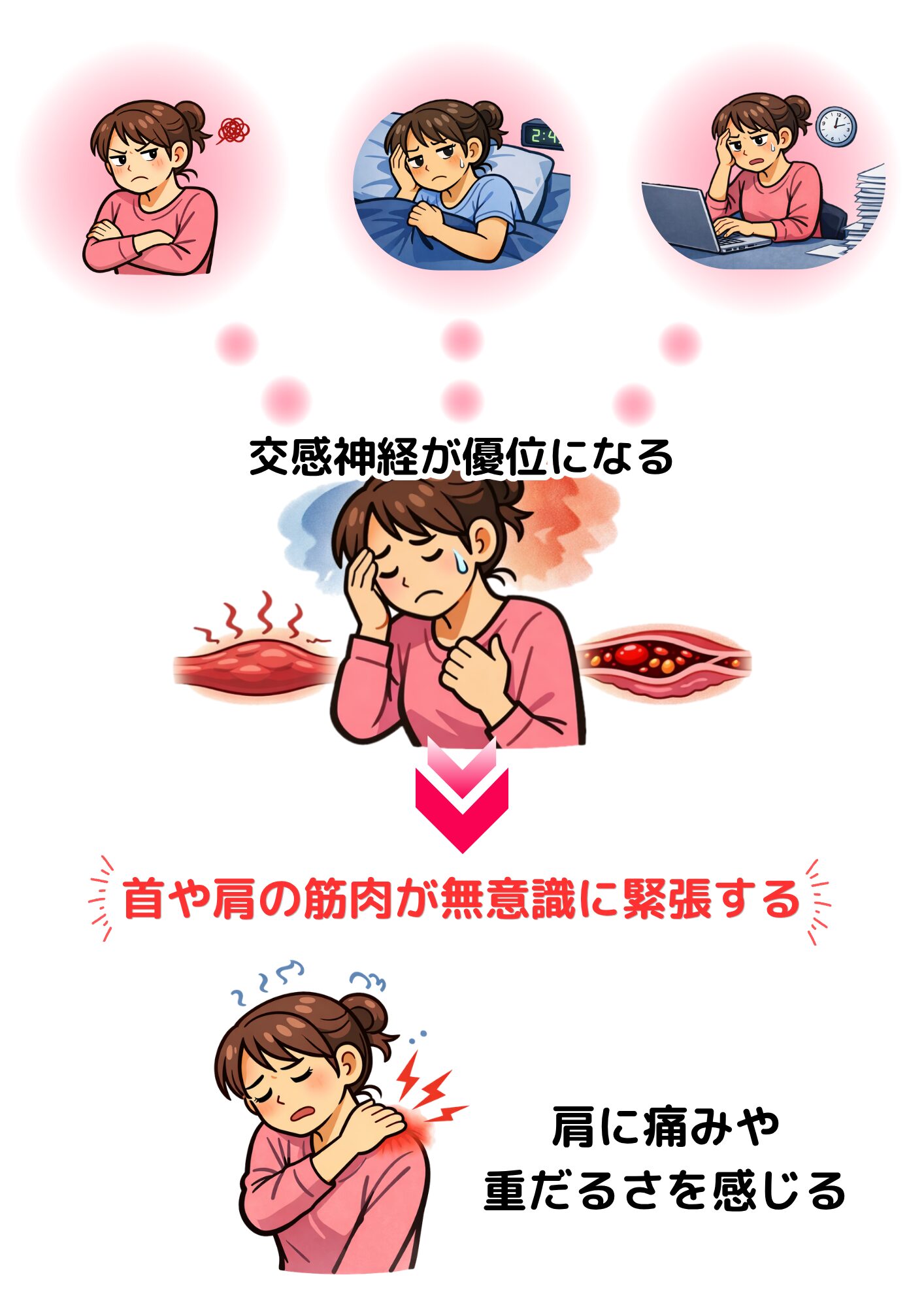= ストレス・不眠・緊張で神経が興奮し、筋肉が勝手に力んでしまう肩こり