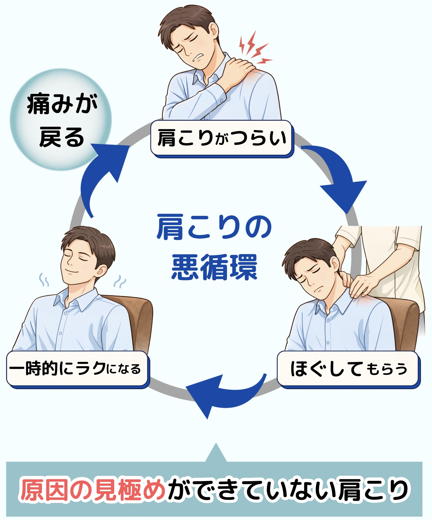 もちろん、一時的に楽になることはあります。ただ、すぐ戻ってしまう肩こりは、肩そのもの以外に原因があることがほとんどです。