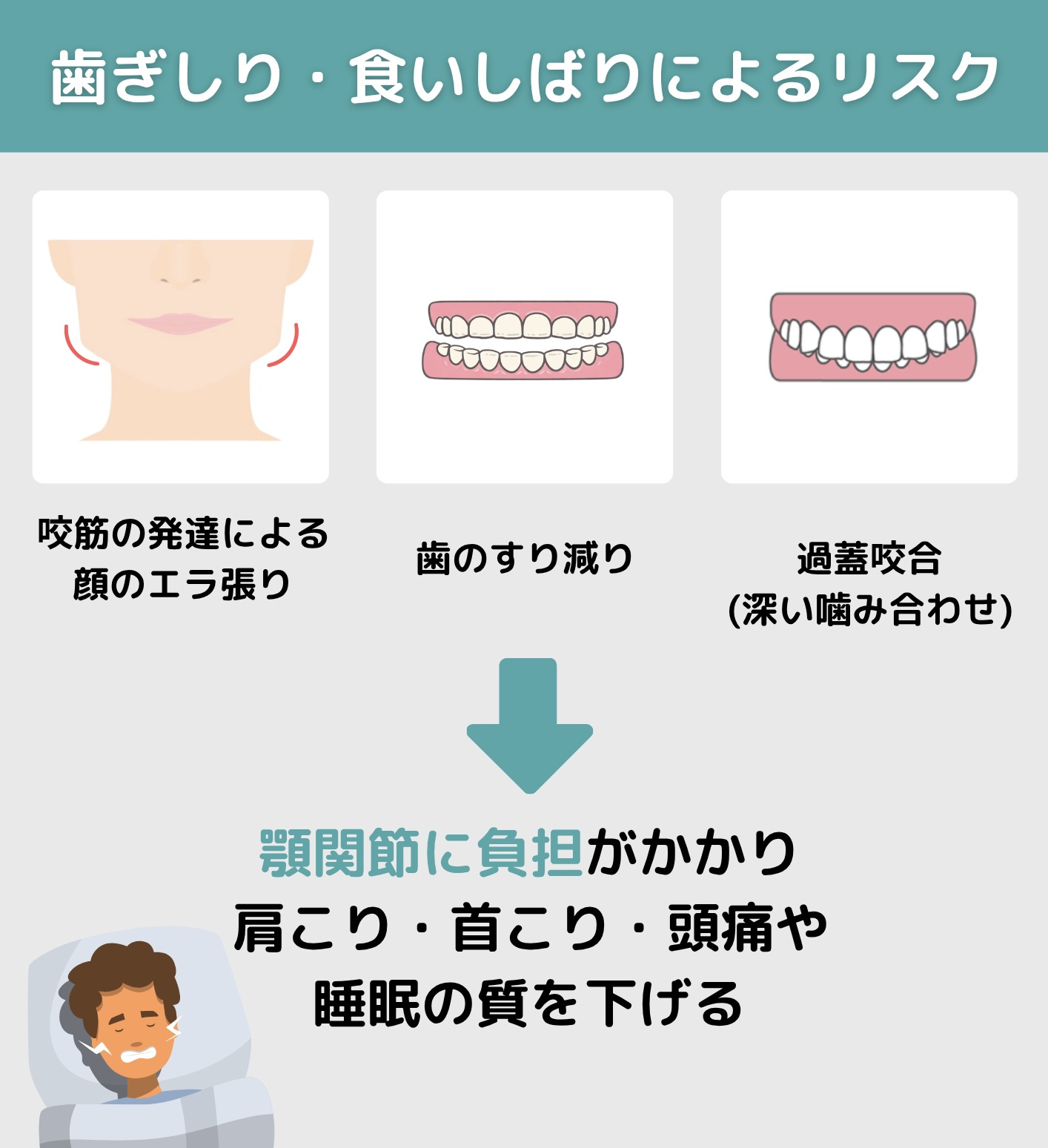放置すると、頭痛や顎関節症、慢性的な首肩こりにつながることもあります。