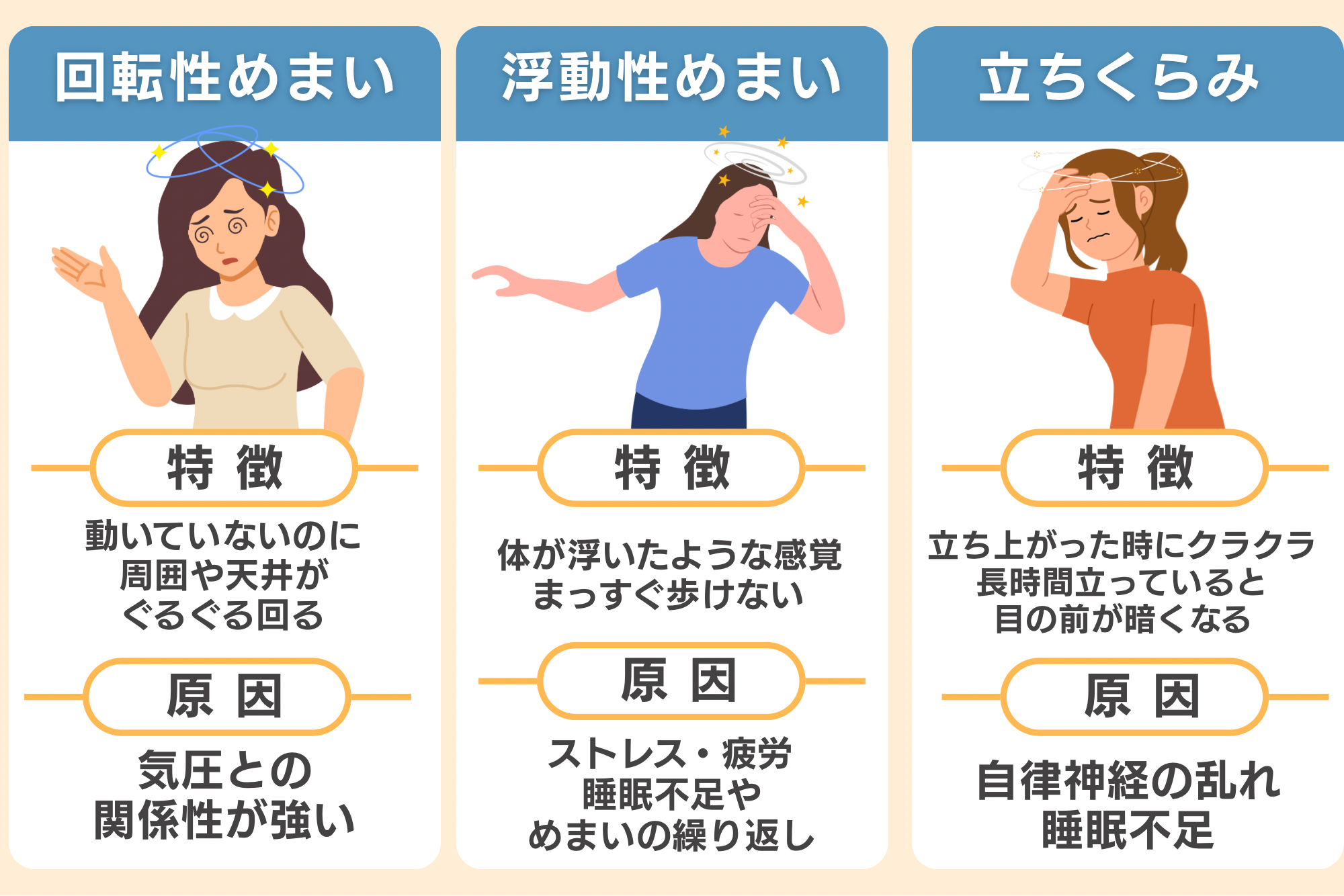 1つでも当てはまる場合、体の回復力が落ちていたり、自律神経のバランスが乱れていたりする可能性があります。特に、疲労・睡眠不足・ストレス・脱水・立ち上がり時の血圧変化は、めまいを起こす要因としてよく知られています。